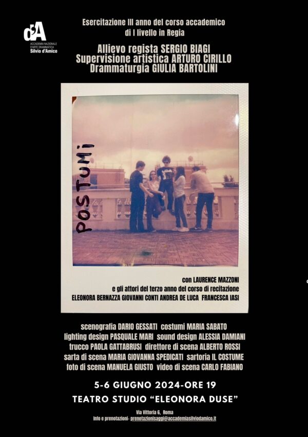 Anteprima POSTUMI Esercitazione III anno del corso accademico di I livello in Regia Allievo regista Sergio Biagi Supervisione artistica Arturo…